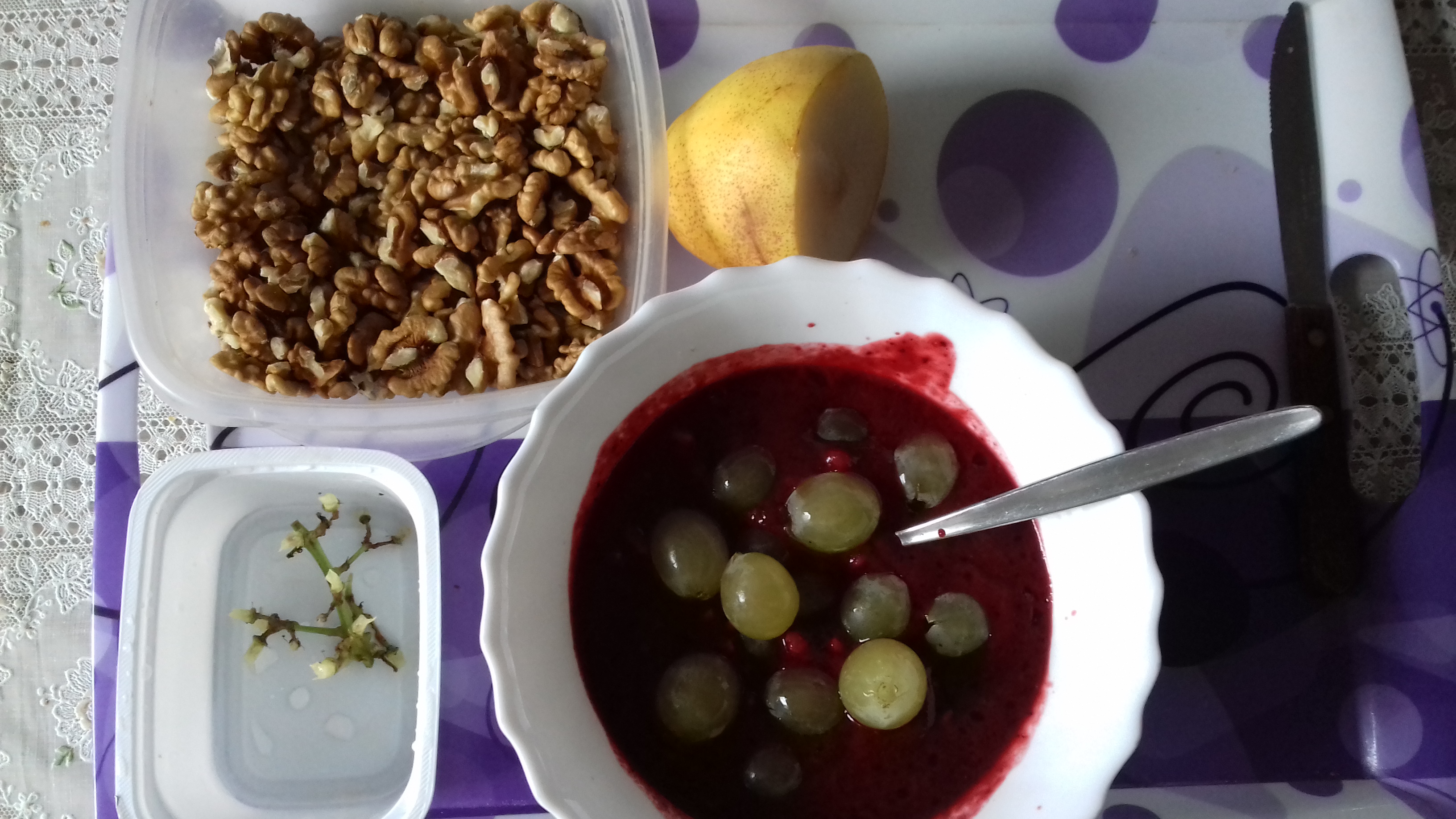 Alap: gabonapehely-keverék mazsolával, napraforgómaggal, szezám és lenmag pehellyel. A gyümölcsöket elsősorban a szezonálisan kapható friss gyümölcsök képezik. Itt pl a szőlő, meg aprított körte.A lilás színű folyadékpép összetétele: gyorsfagyasztott meggy, szamóca, fekete ribiszke,szeder,málna,piros ribiszke.(Bioflavonoidok!) A gyorsfagyasztott gyümölcskeverék szobahőmérsékleten felenged, majd turmixolom és némi céklalét, almalét adok hozzá. Mivel ez az adag elég sok lesz, így dunsztos üvegben tárolom hűtőben és a reggeli müzliadaghoz adok hozzá amennyit felvesz. A dió is nagyon fontos komponens!